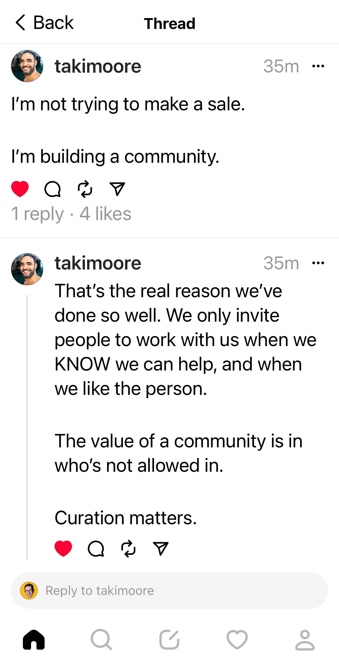 I’ve been following Taki Moore for about a year. He does sell stuff. But he builds community first by giving away LOTS of value for free, no strings attached. I’ve never paid him for anything, but I’m darn sure part of his community of followers.